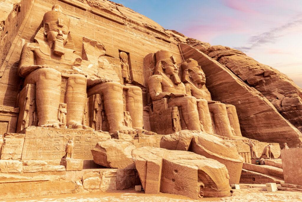 Los impresionantes templos de Abu Simbel, estuvieron a punto de desaparecer por la construcción de la Presa de Aswan; pero gracias al llamamiento mundial de la UNESCO se pudo trasladarlos pieza por pieza hasta el actual emplazamiento (200 metros por detrás del y60 metros por encima del lugar original) que le ha permitido perdurar hasta nuestros días. El principal punto de referencia del complejo es el templo de Ramsés II, cuya fachada principal cuenta con 4 estatuas asombrosas de 20 metros de altura y representa la majestuosidad del Antiguo Egipto. Deléitese con esta imagen tanto de día como de noche, cuando la iluminación se refleja directamente en su piedra. Si camina hacia el interior, encontrará una extensa galería y varias salas para honrar a los dioses de la cultura egipcia. En Abu Simbel también encontrará el templo dedicado a la reina Nafertari, la favorita esposa de Ramsés II. En la fachada principal hay 6 estatuas de igual tamaño que representan en 4 ocasiones a Ramsés II y en 2 a la propia Nefertari, pero siempre con atributos diferentes.